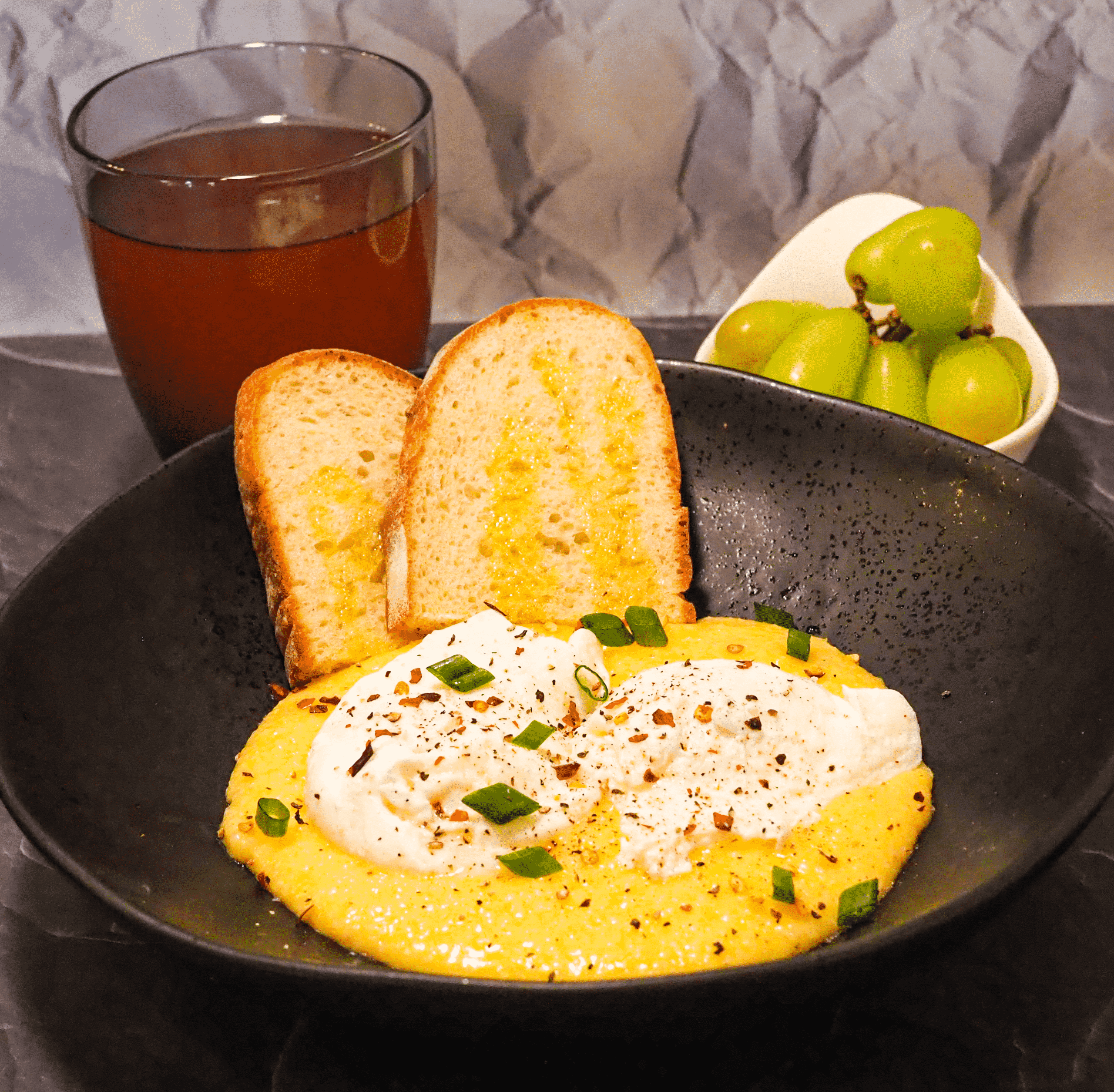 - Serve the eggs and grits with toast, and grapes. Garnish with scallions and sprinkle with red pepper flakes (if using).
