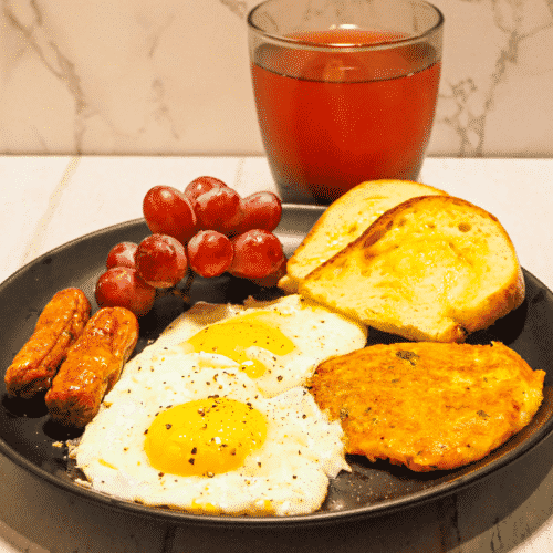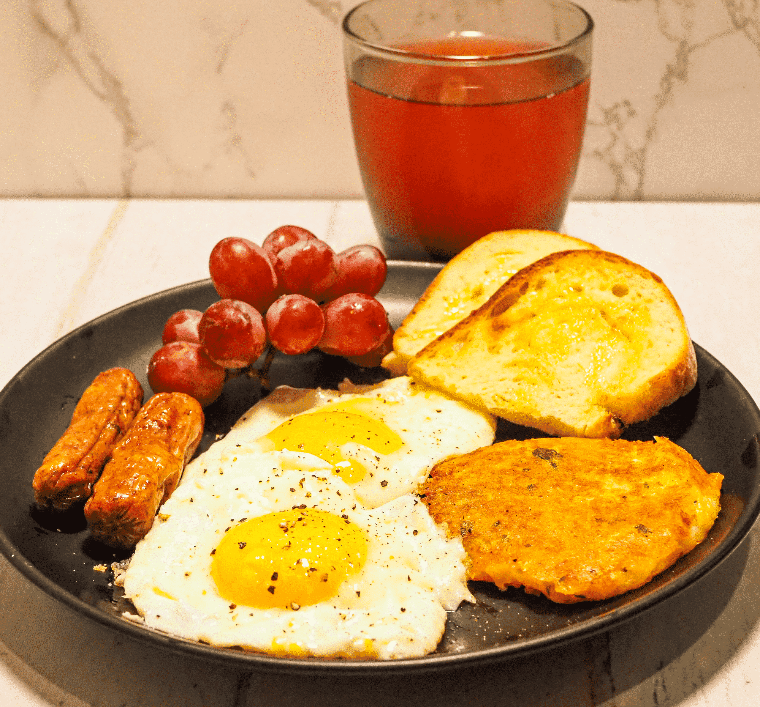 - Serve the eggs with potato pancakes, sausage, toast, and grapes.