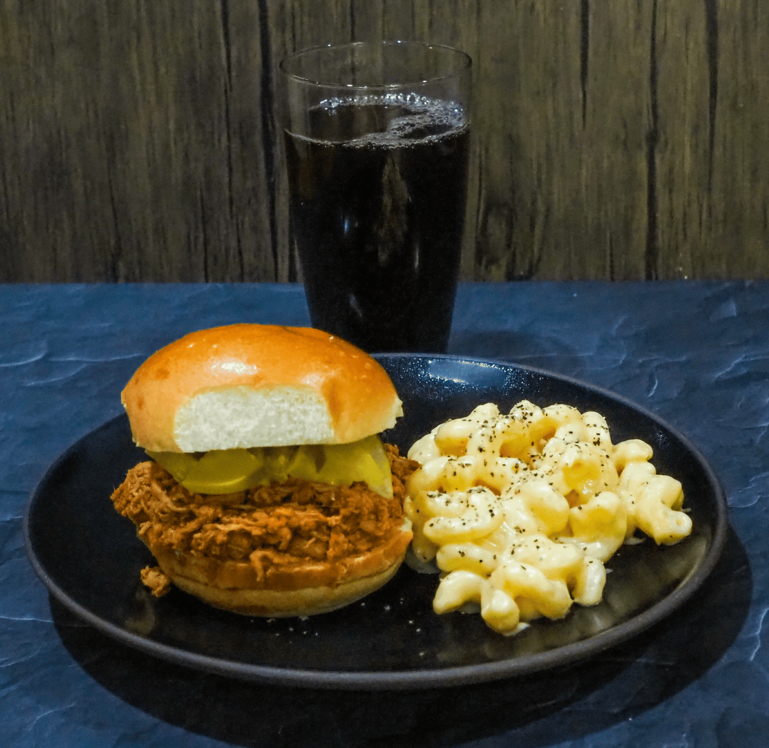 - Portion the pork onto the roll, and spoon some of the sauce over top, top with chopped pickle (if using). Serve with mac and cheese and soda.