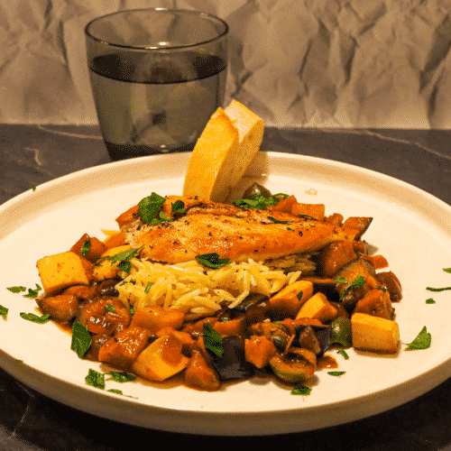 - Add the eggplant and squash to the pan. Sauté until nicely browned. Then add the onion, garlic, and oregano; sauté until softened. Stir in the olives, capers, broth, and tomato paste. Bring to a low simmer, stirring occasionally, add the chicken to the pan and cook to an internal temperature of 160 degrees using a thermometer. (The sauce should be a thickened creamy consistency, add more broth during cooking if needed to thin out or to add a bit more volume to the sauce).