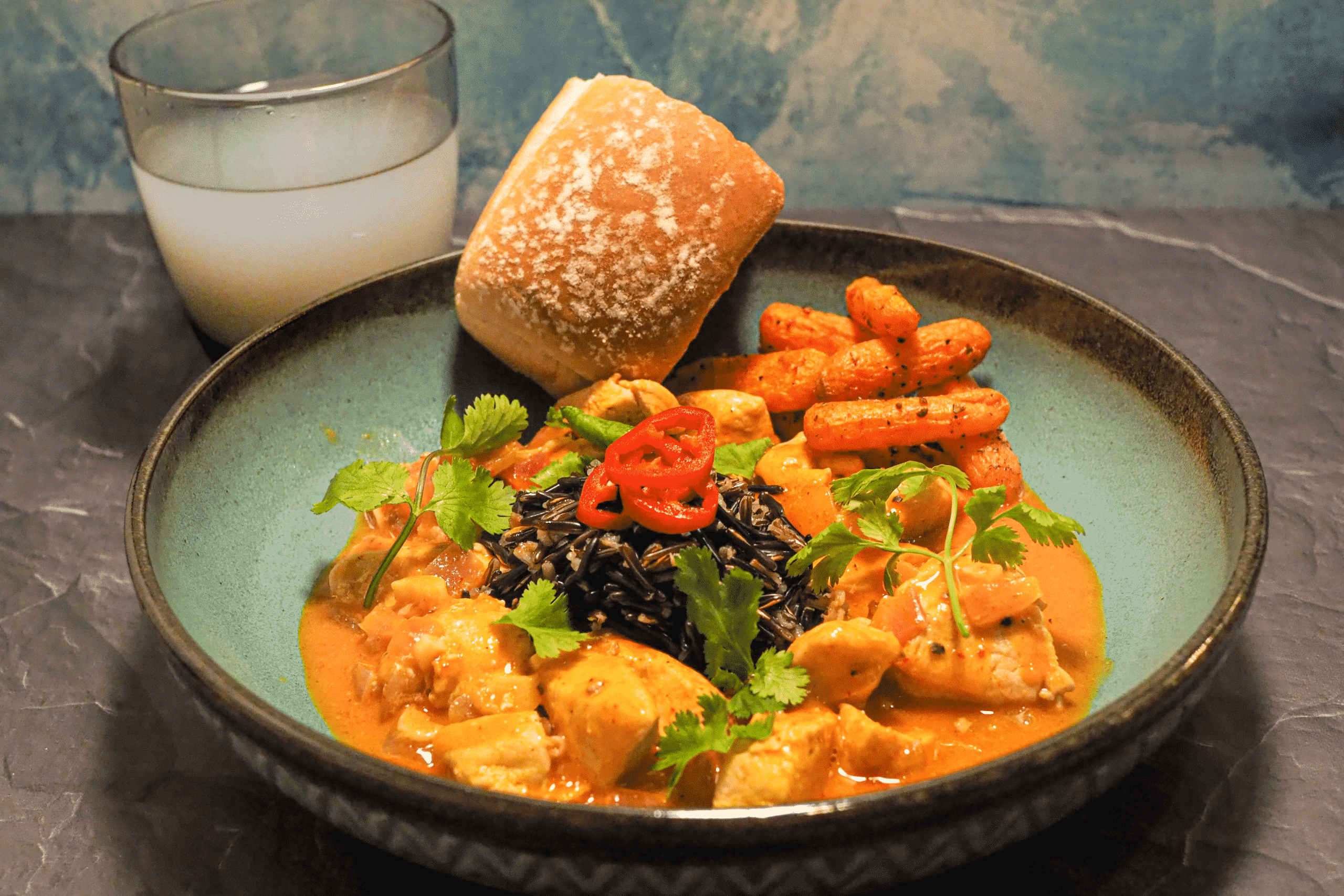 • Stir in the coconut milk, broth, lime juice, and red curry. Bring to a simmer until the chicken reaches an internal temperature of 160 degrees and the sauce concentrates in flavor and thickens. Season with salt and pepper to taste.