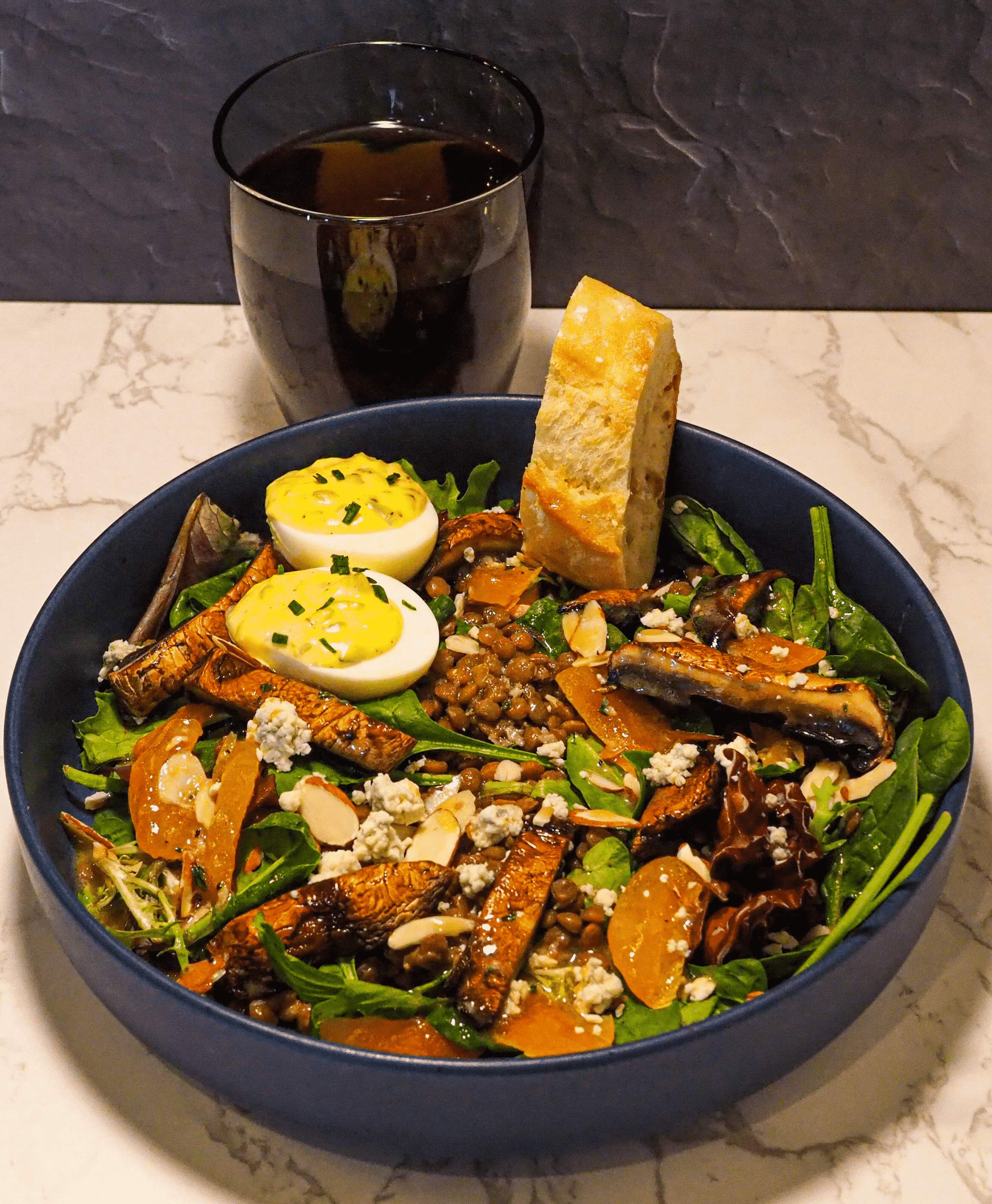 - Once the lentils are cooled down mix them with the spring mix and portion evenly. Top with mushrooms, aprictos, and almonds. Sprinkle with finely crumbled blue cheese and spoon the dressing over top (be careful not to over dress the salad). Serve with bread.