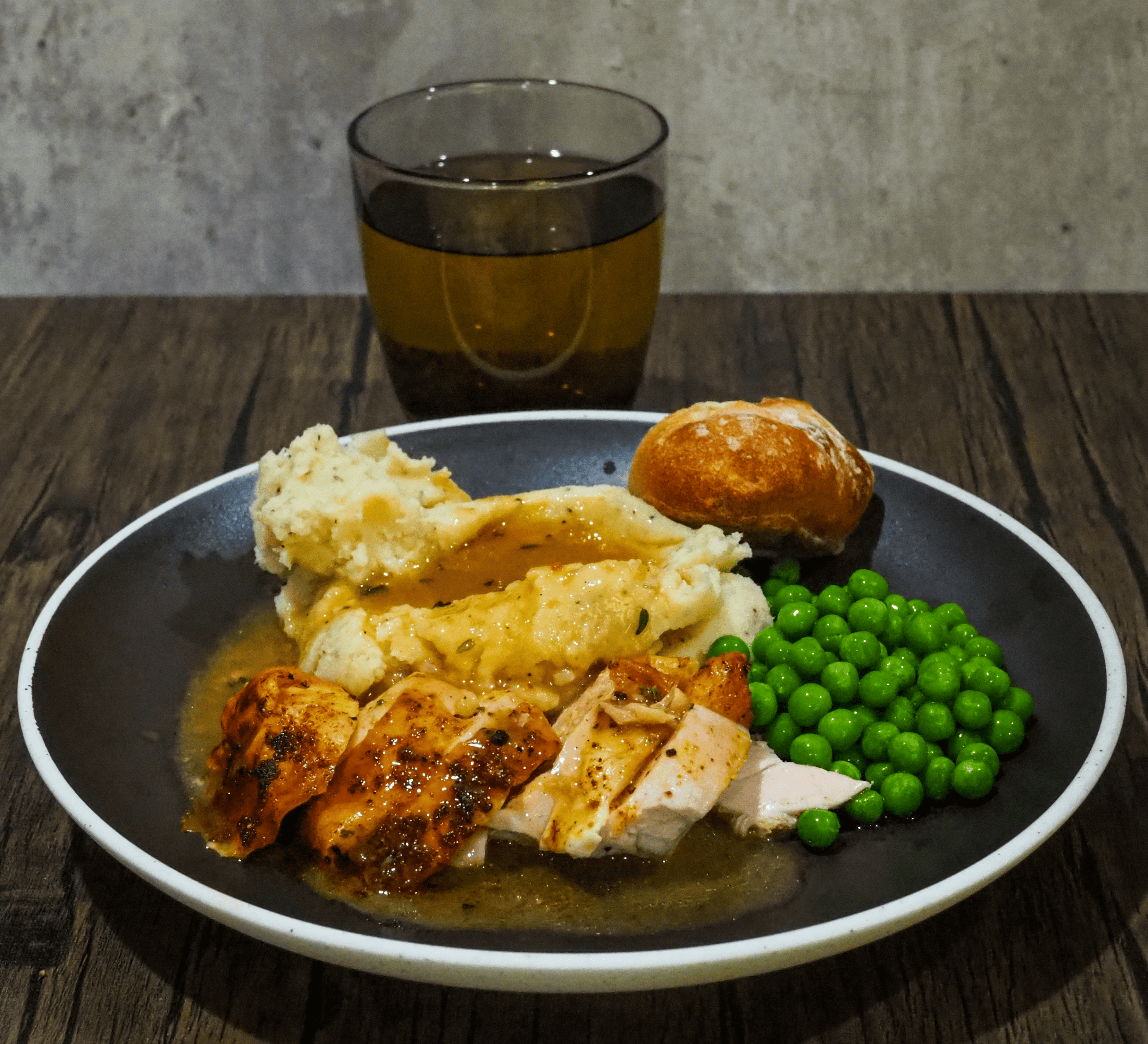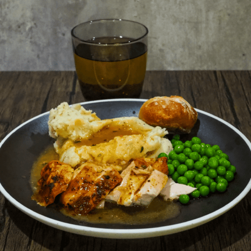 • Serve: Enjoy the turkey with gravy, mashed potatoes, peas, bread, and apple juice.