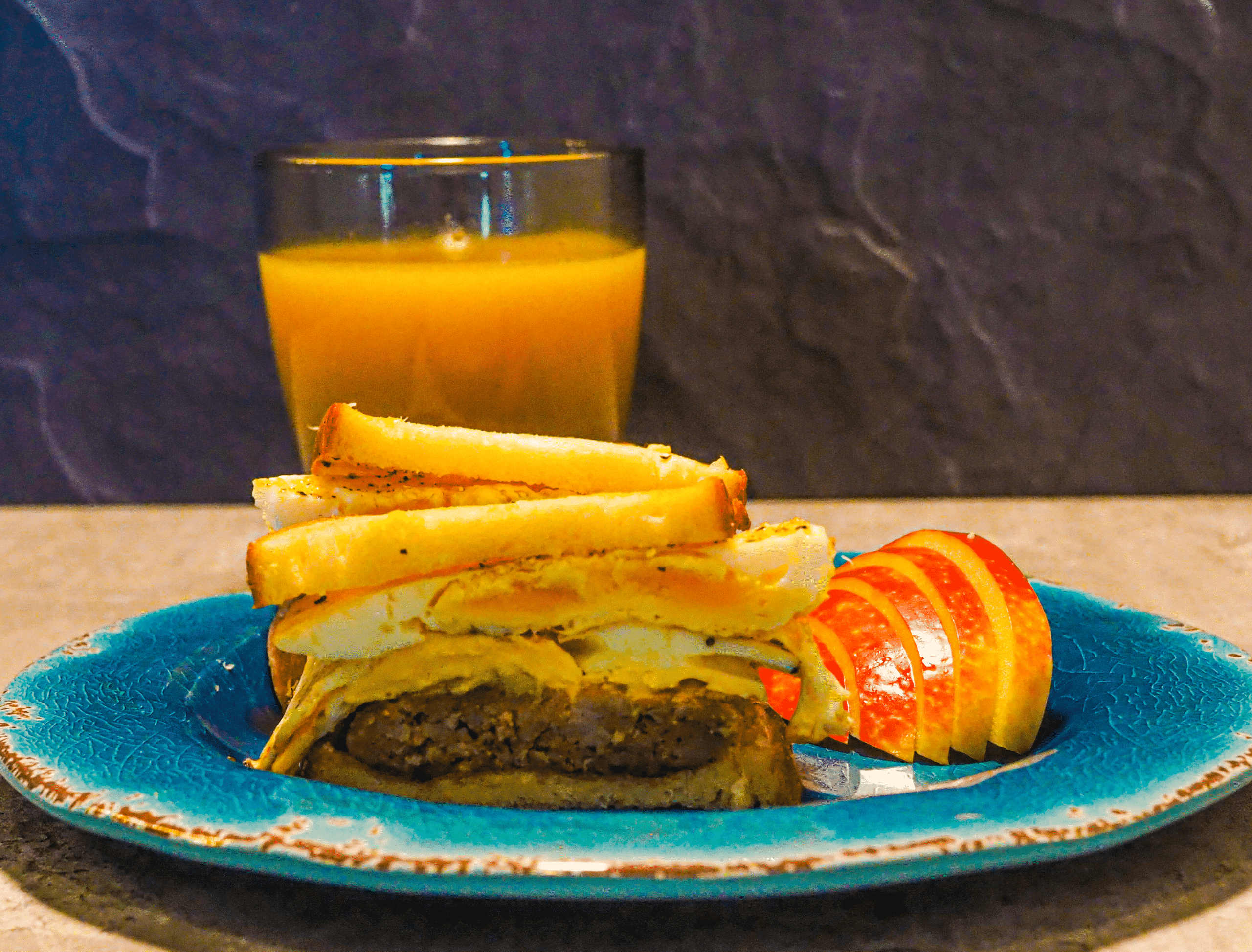 • Place the sausage patty and eggs on the bread. Cut in half and serve with apple.