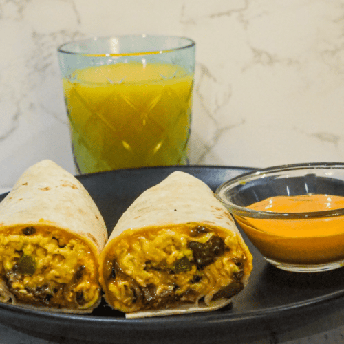 - Serve: Cut the wrap in half and enjoy with sauce and orange juice