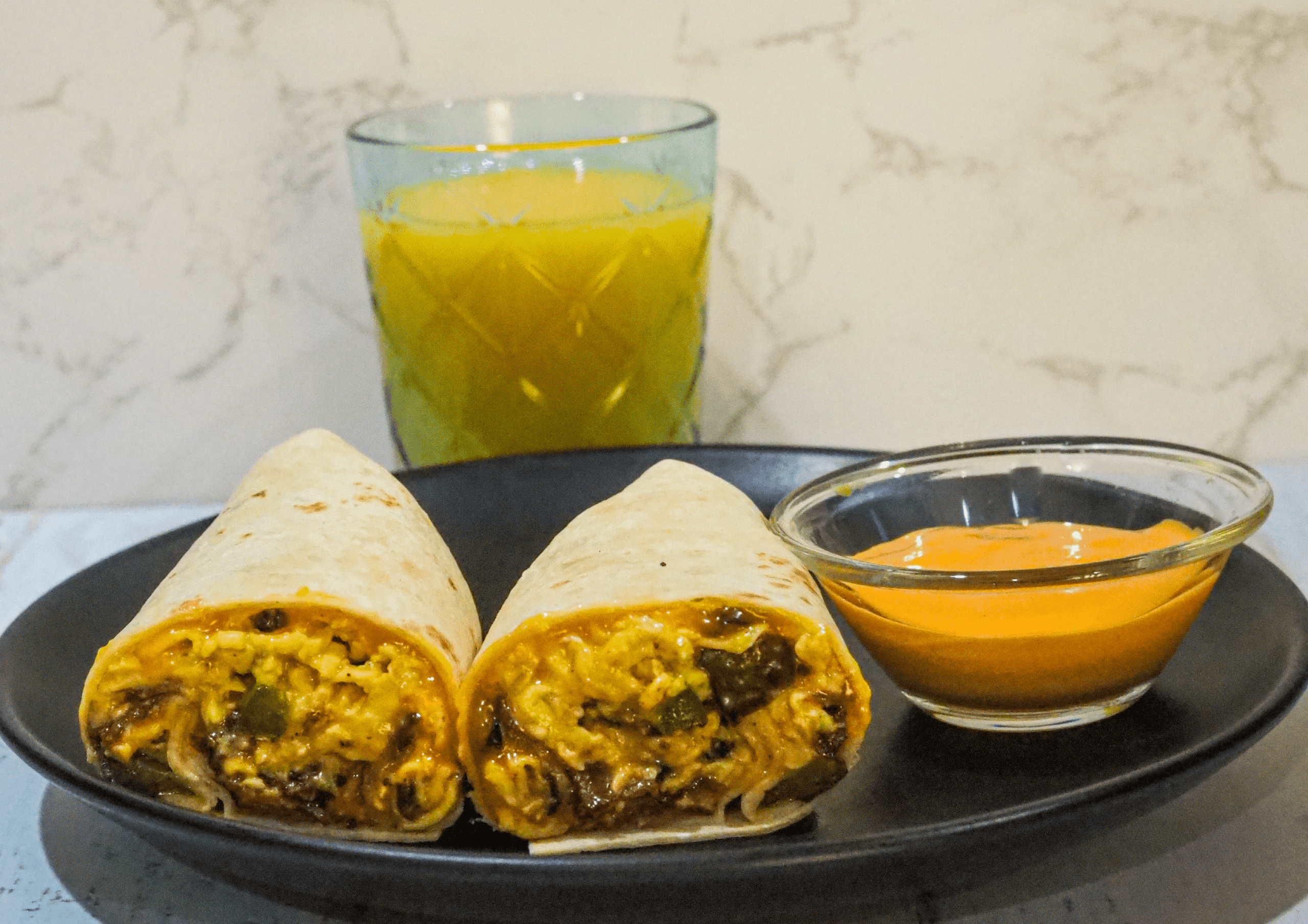 - Serve: Cut the wrap in half and enjoy with sauce and orange juice
