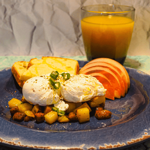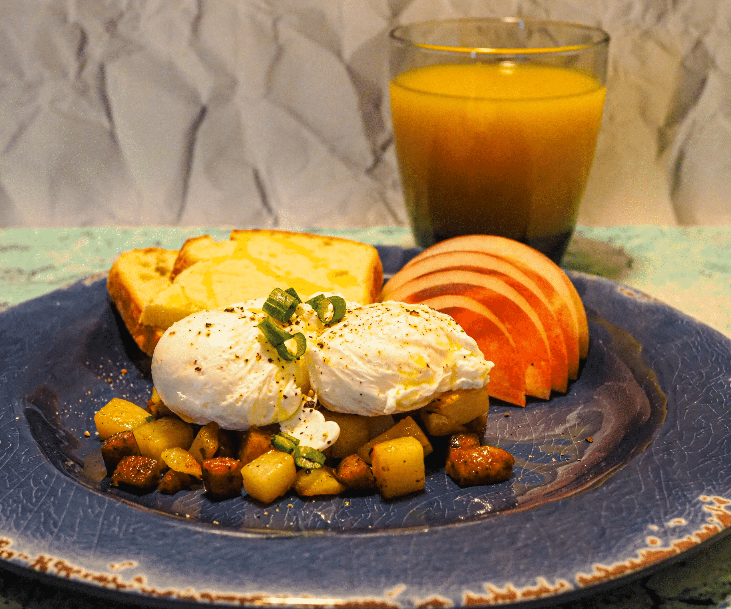 - Serve the hash with eggs, toast, and peach. Garnish with scallions.