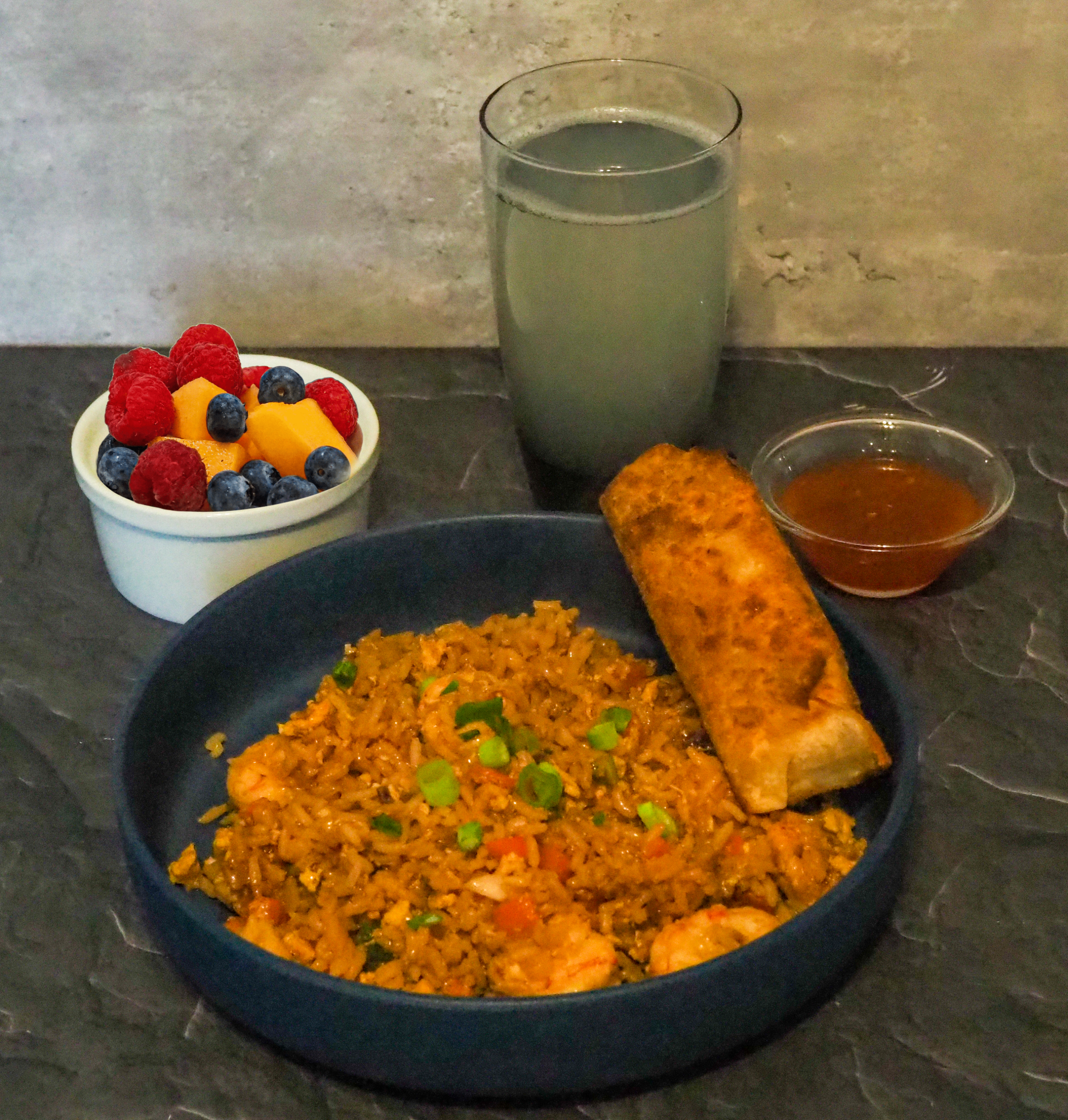 - Serve the fried rice with spring roll, sauce, fruit, and coconut water.