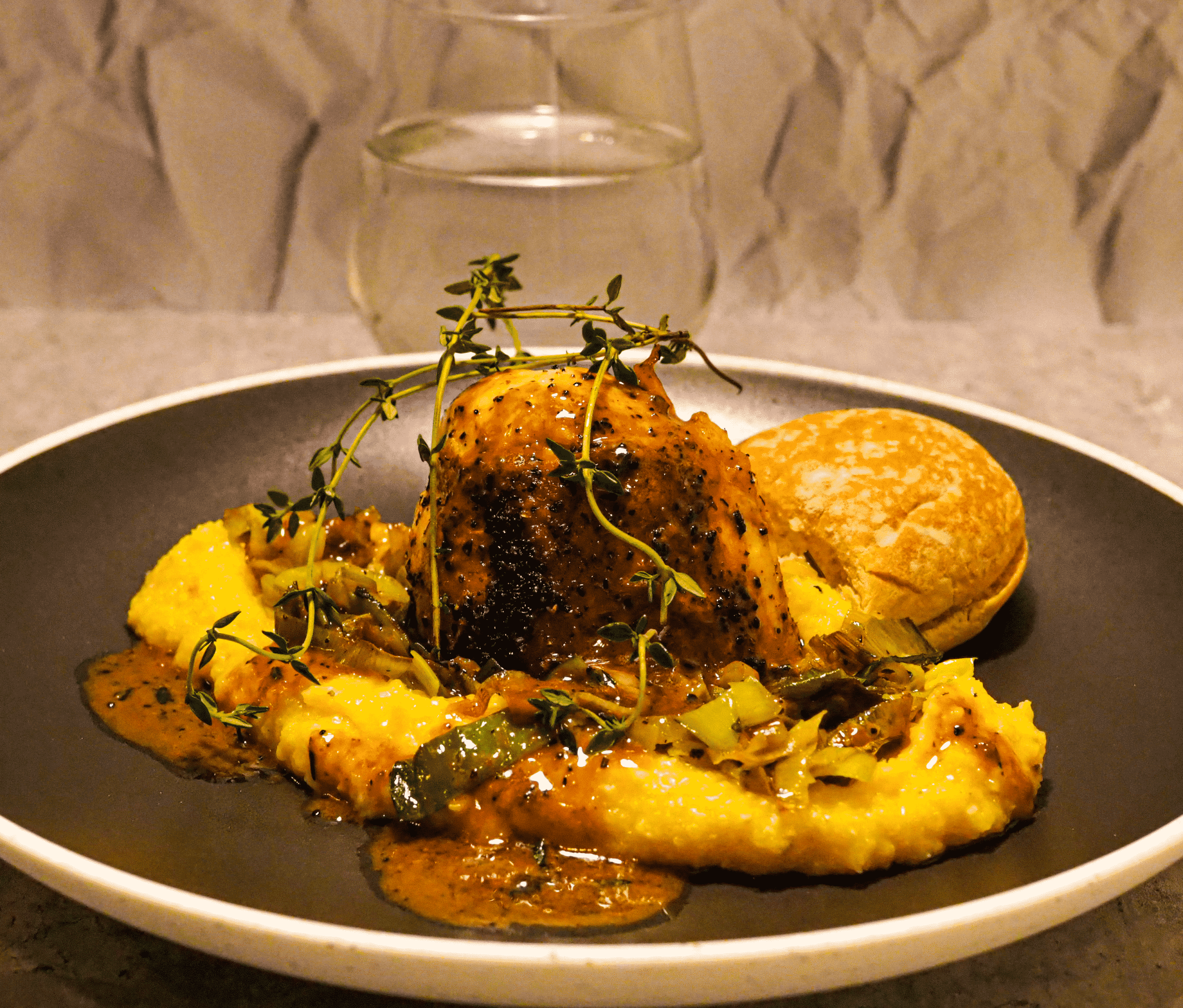 - Heat an oven-safe skillet or sauté pan on medium high heat. Once the pan is hot, add the remaining oil. Place the chicken skin side down in the pan until the skin is deep golden brown. Flip the chicken over and transfer the pan to the oven and roast until a thermometer inserted in the thickest part of the meat, (not near a bone), registers 160°F, about 20 to 30 minutes. (Could be more or less depending upon size). Transfer the chicken to a carving board and let rest.