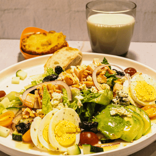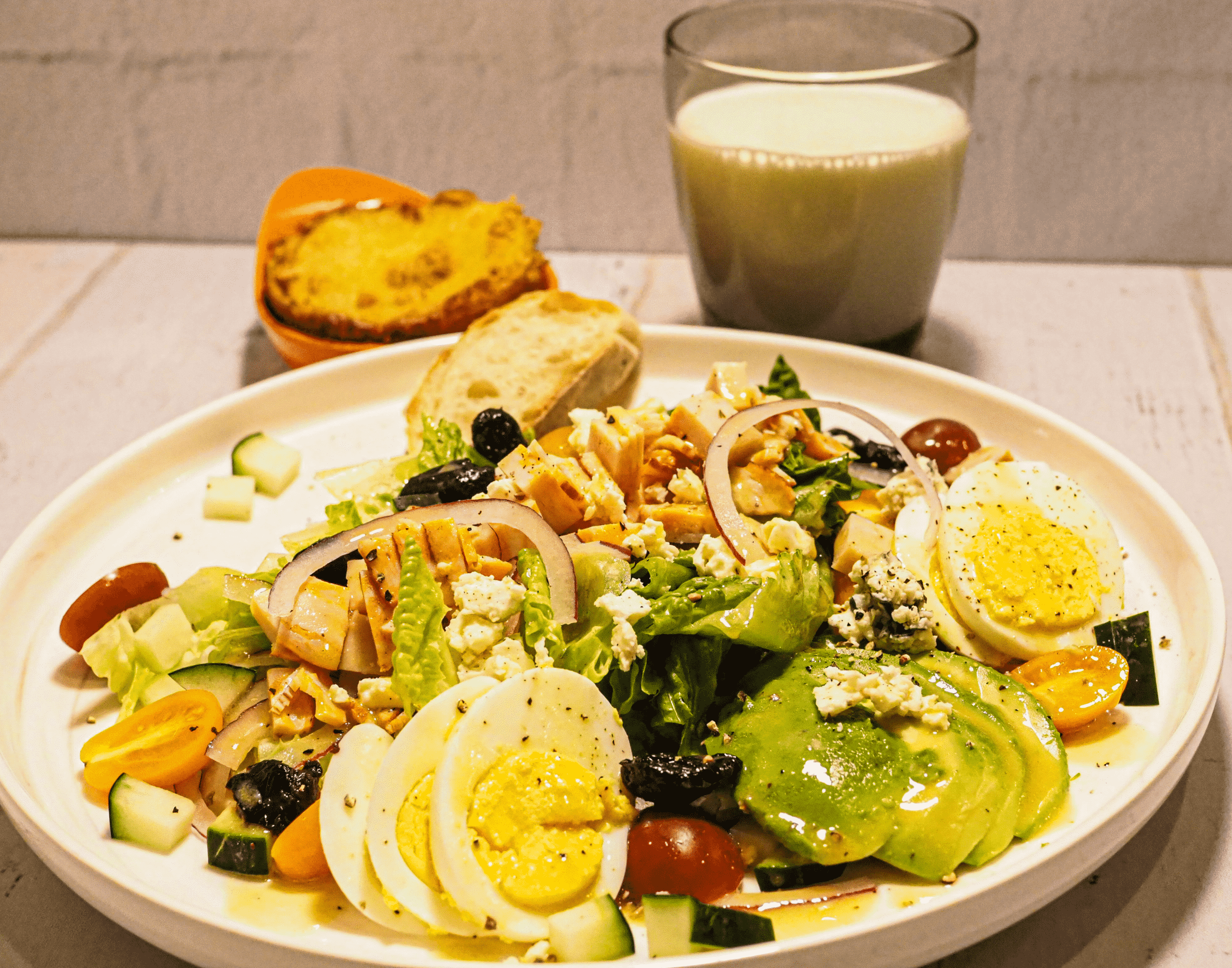 • Lay down the lettuce, top with smoked turkey, hard boiled eggs, avocado, cucumber, tomato, onion, olives, and blue cheese.