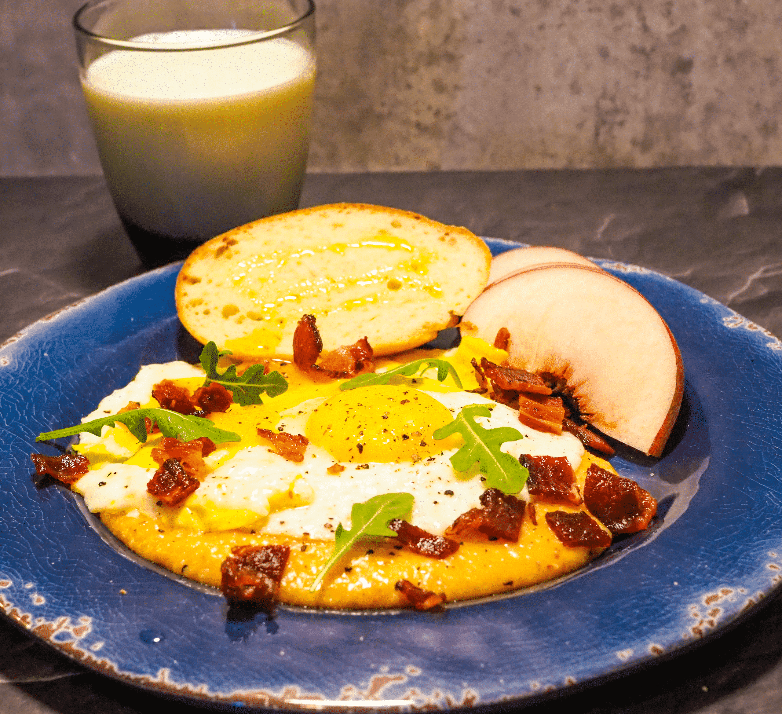- Place the eggs over the grits and top with bacon and scallions. Season with salt and pepper. Serve with toast and peach.