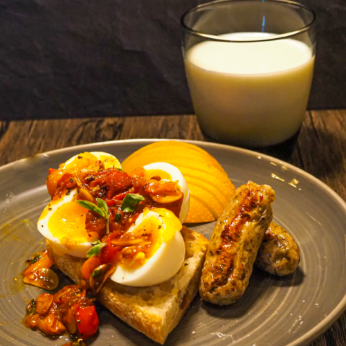 • Cut the eggs in half on the plate and season with salt and pepper. Spoon the bruschetta over top. Garnish with red pepper flakes if using. Serve immediately with sausage, toast, and pear.