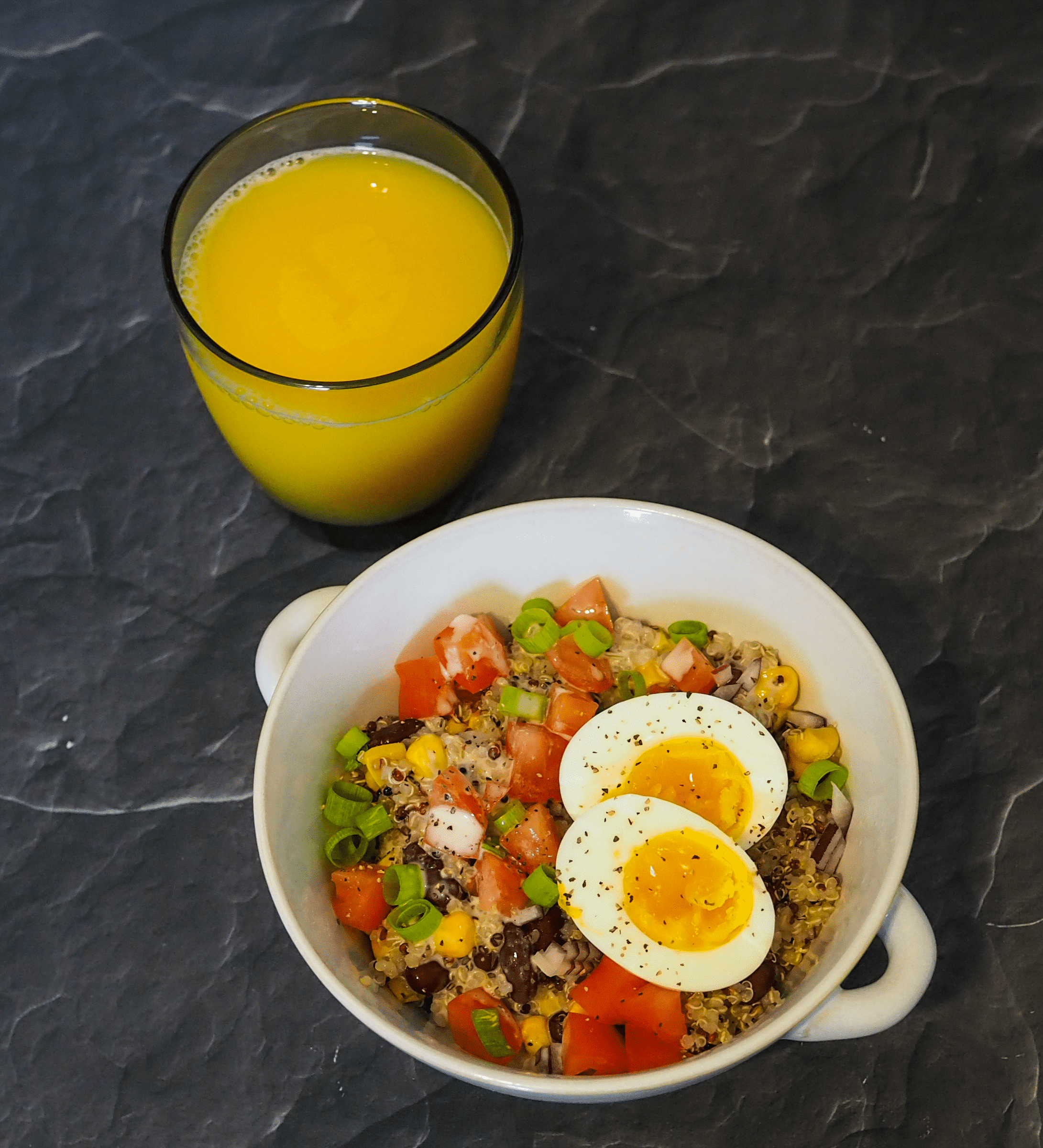 - In a large bowl, combine black beans, tomato, corn, cilantro, and avocado. Fold in cooked quinoa.