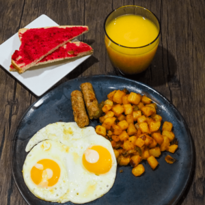 - Serve the eggs with sausage, potatoes (ketchup optional), toast, and orange juice.