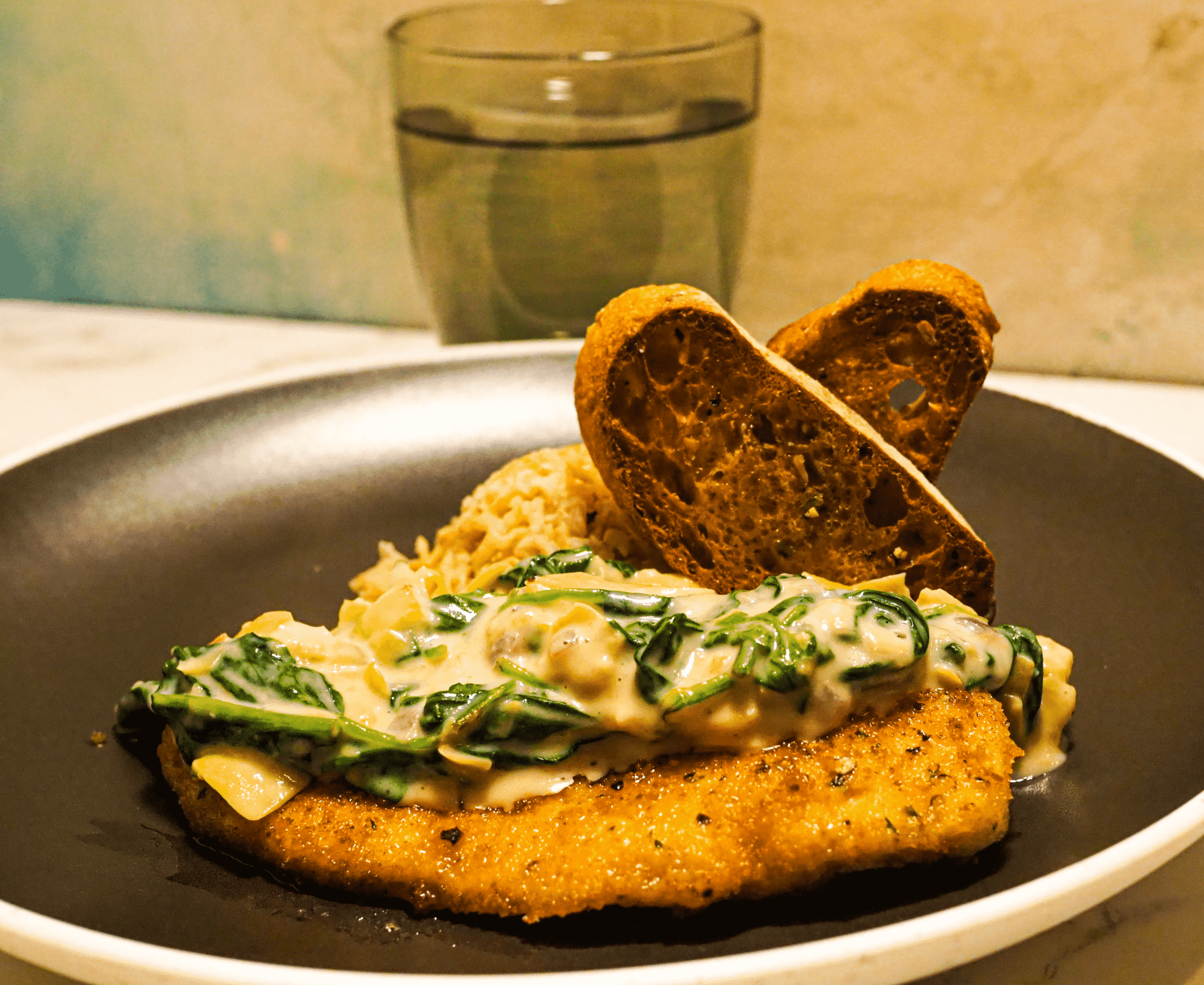 - Season the chicken on both sides with salt and pepper. Coat well on both sides with breadcrumbs. Pressing the breadcrumbs onto the chicken using your hands. Then set aside.