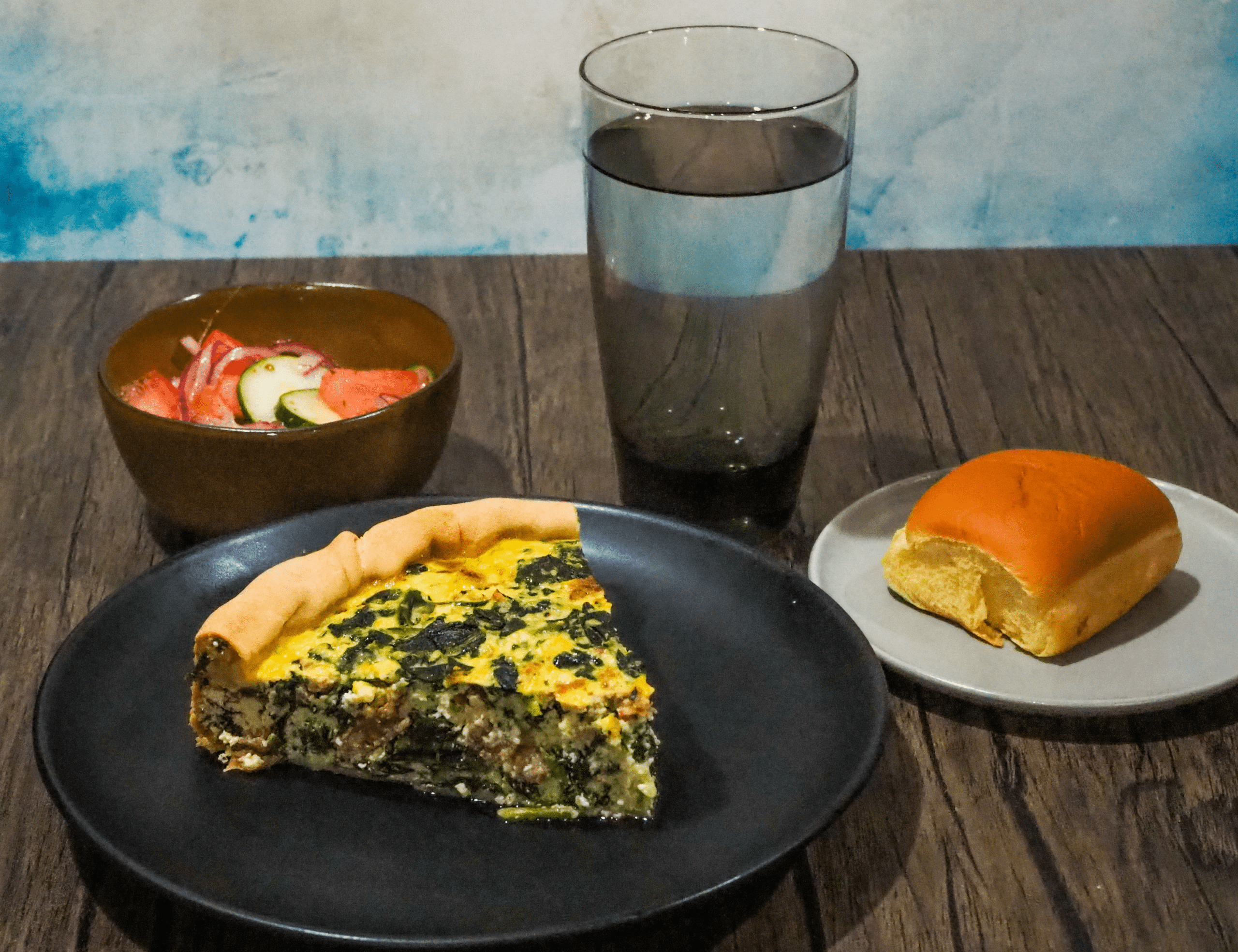 - Portion the quiche, serve with tomato salad, roll, and sparkling water.