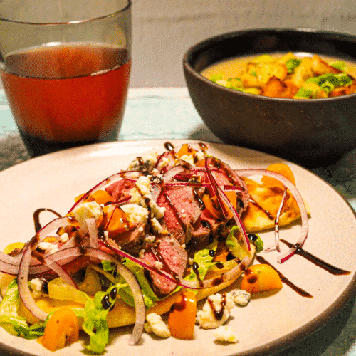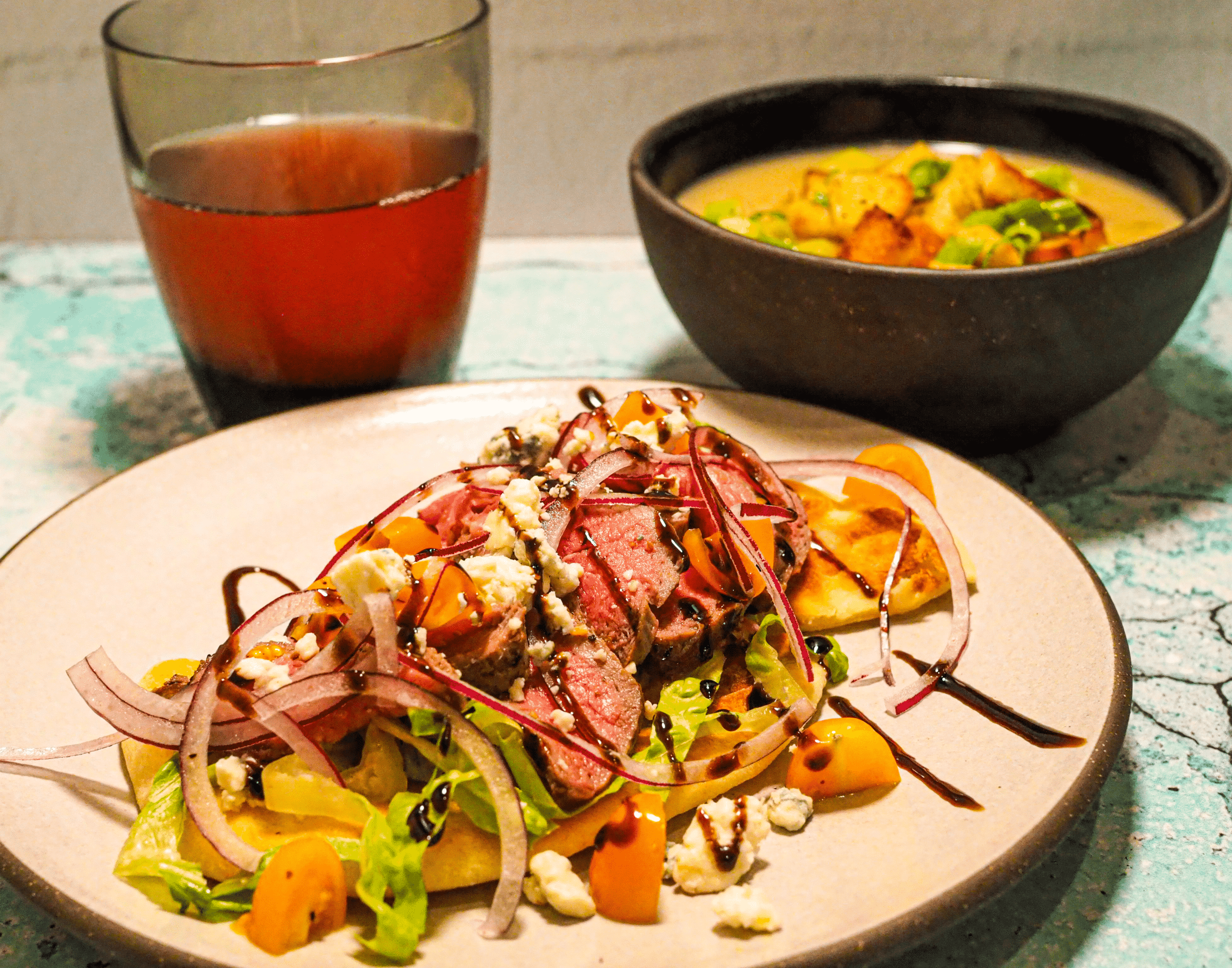 - Top the flatbread with lettuce, tomatoes, onion, steak, and blue cheese. Drizzle with balsamic glaze. Season with salt and pepper if needed.