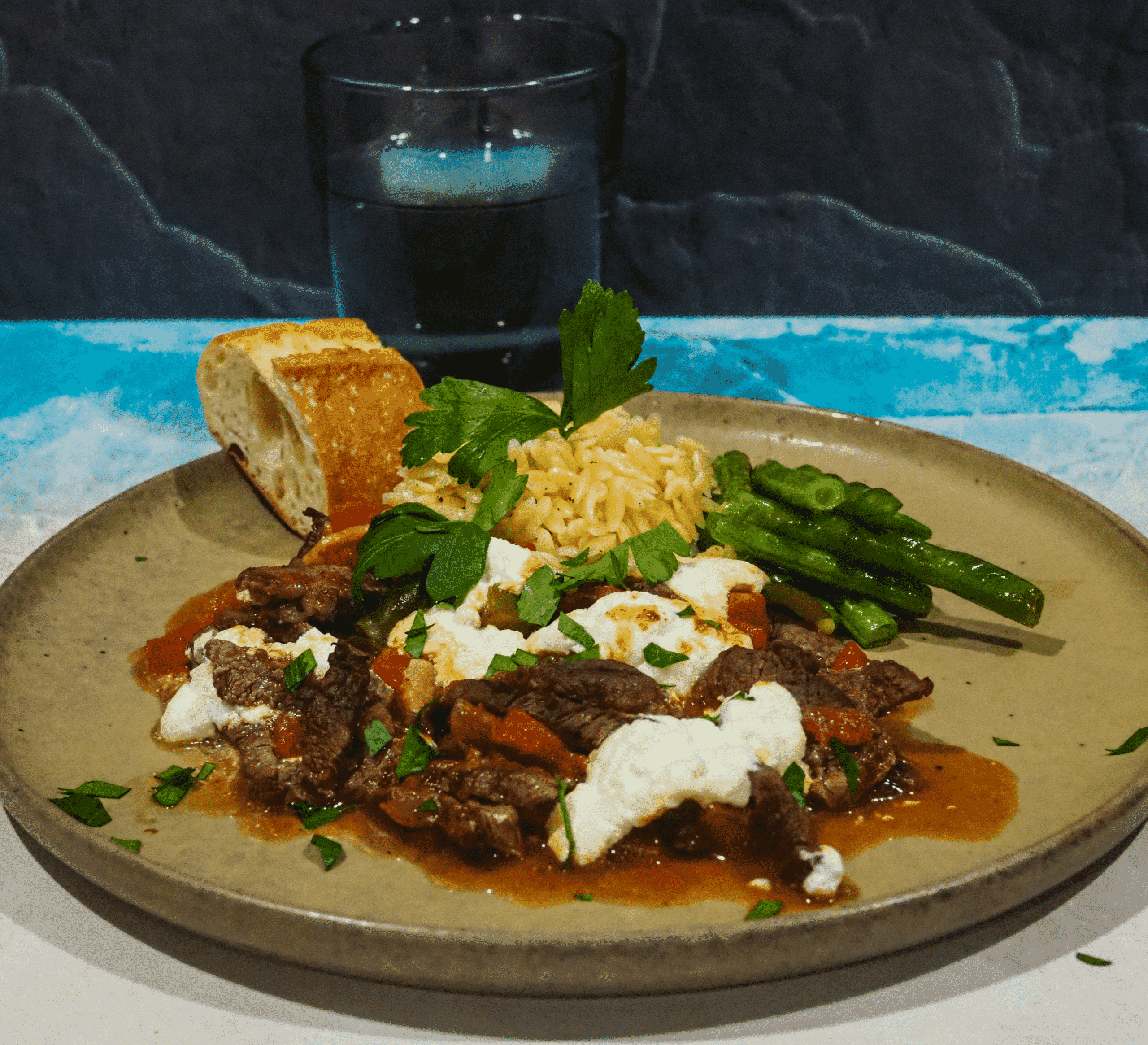- Heat a saute pan over medium heat. Once hot, add the oil. Saute the onion, peppers, and garlic until softened. Then push to the side of the pan. Add the sirloin and oregano, brown well. Mix everything together and saute. Season with salt and pepper.