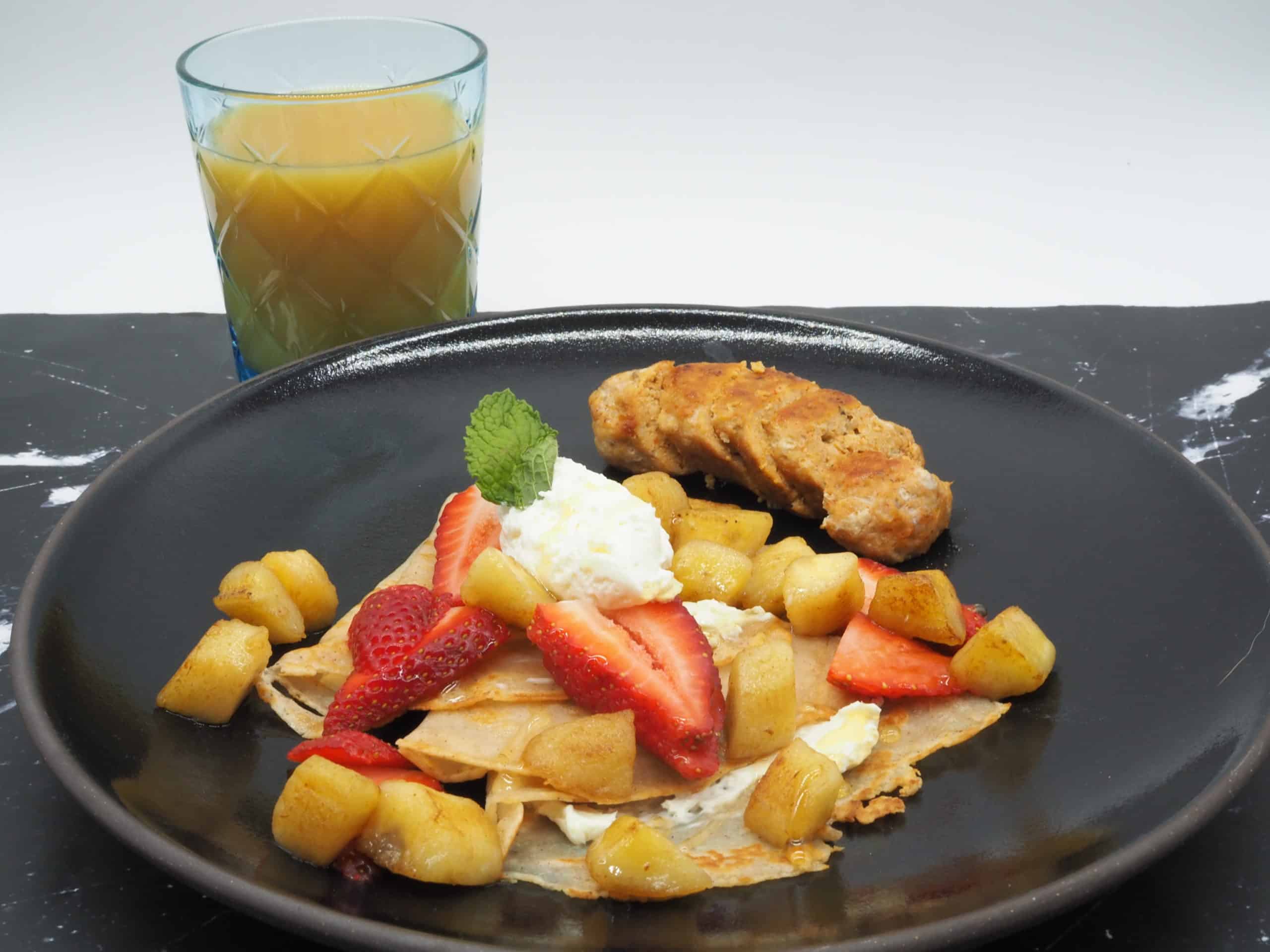 - Spread cream cheese inside the crêpe shell, then fold or roll up. Top with whipped cream, strawberries and banana. Drizzle with honey. Serve with chicken sausage. Garnish with mint.