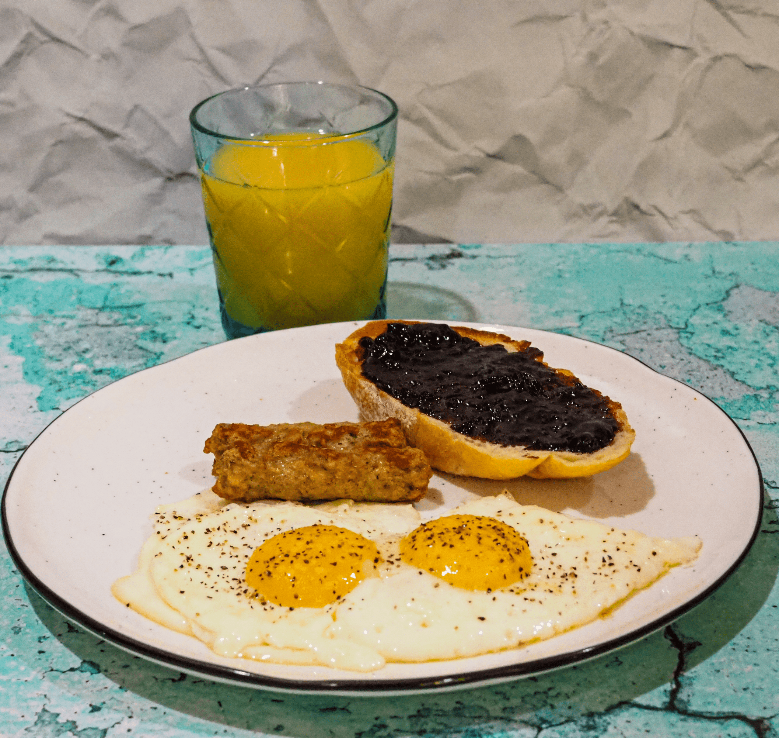 - Serve the eggs with sausage, toast, and orange juice.