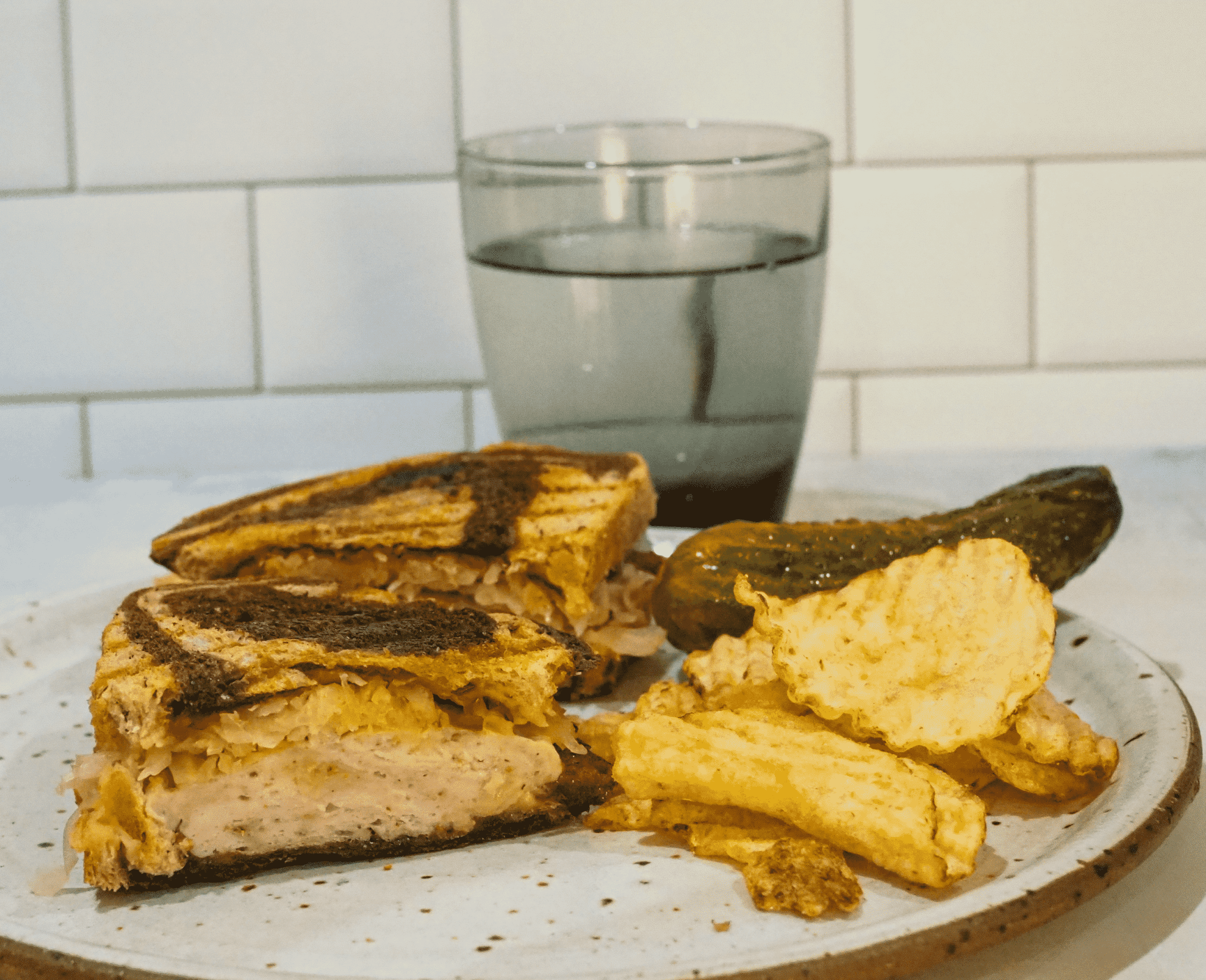 - Cut in half and serve with pickles and chips.