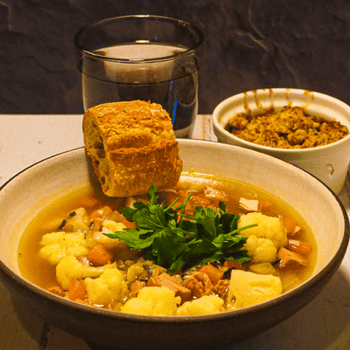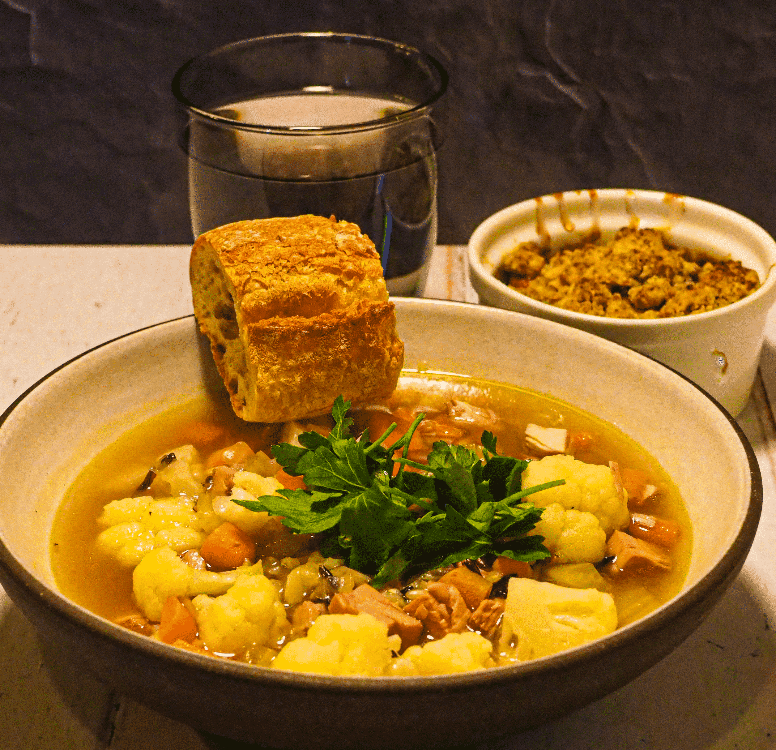 - Portion into bowls and garnish with parsley. Serve with bread.
