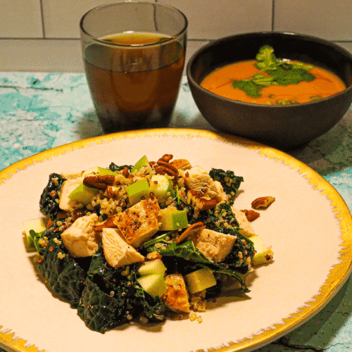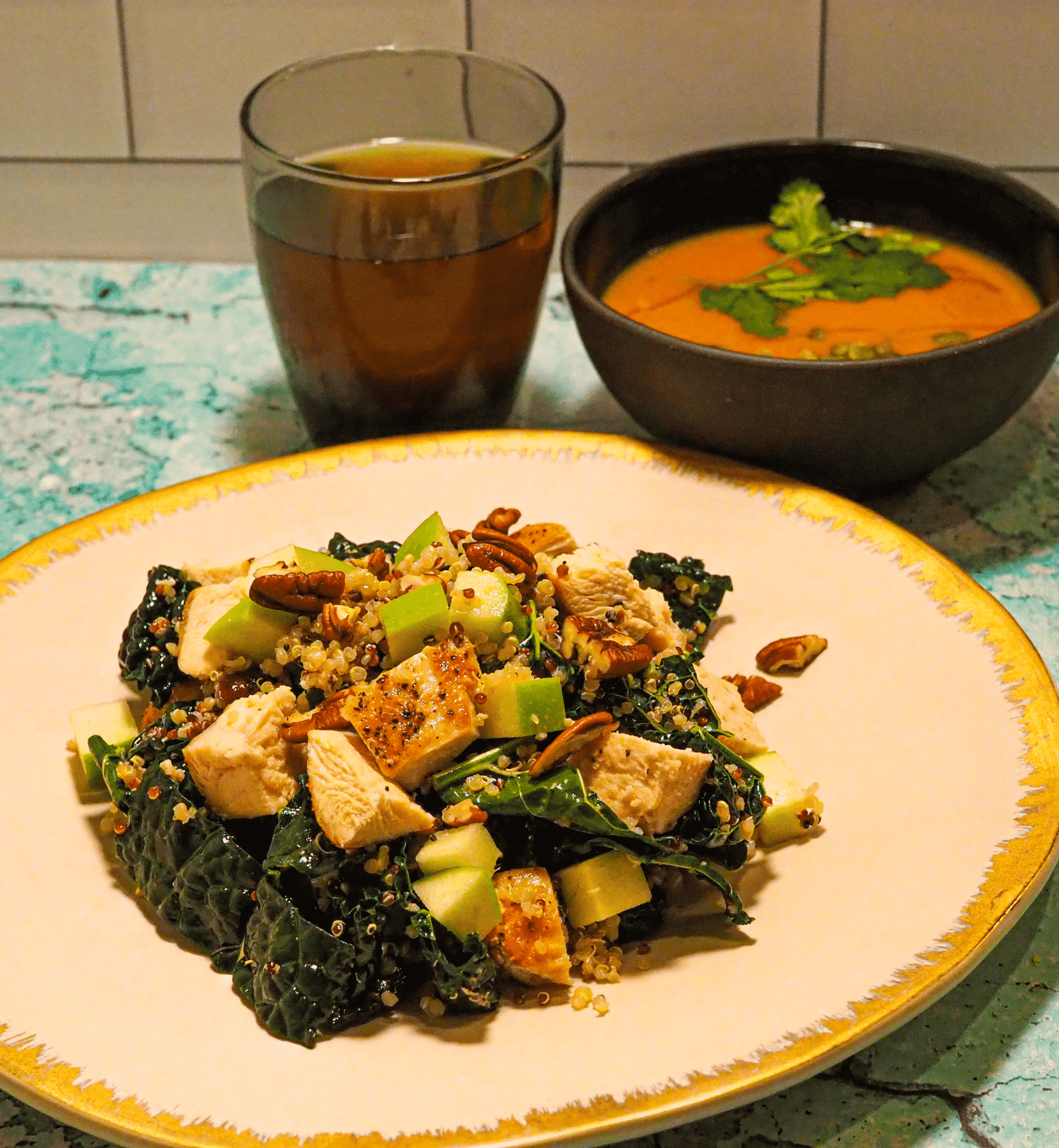 - Mix the apple, pecan, and dried cherries into the kale/quinoa. Then mix in the chicken. Season with salt and pepper if needed before serving.
