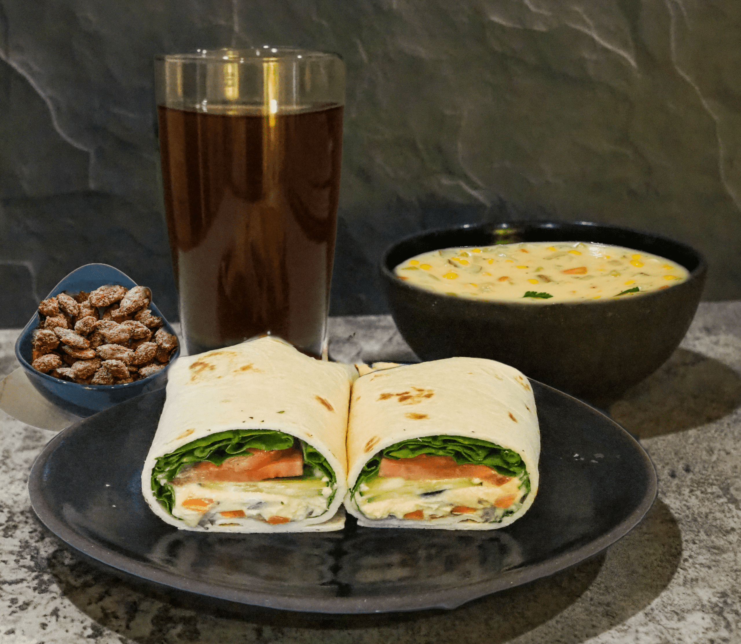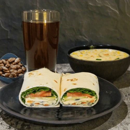 - Serve the wrap with soup and kombucha. Enjoy with almonds for dessert.