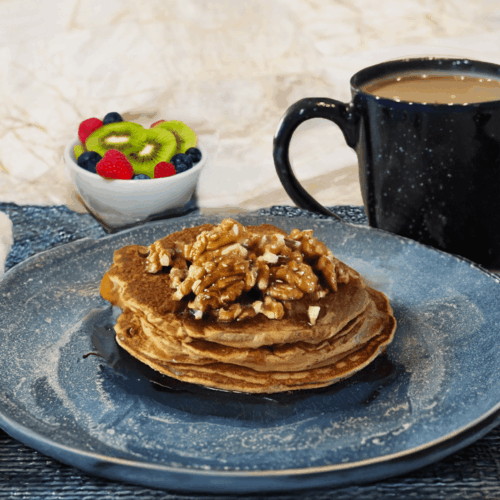 - Serve pancakes topped with chopped walnuts and a generous drizzle of honey, with fruit and coffee.