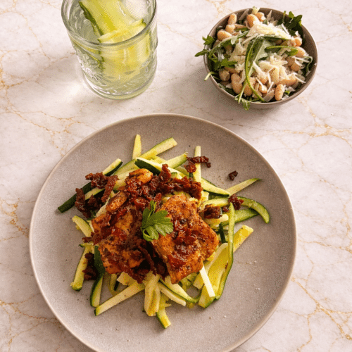 - Serve the chicken over the zucchini noodles with white bean arugula salad and cucumber water.