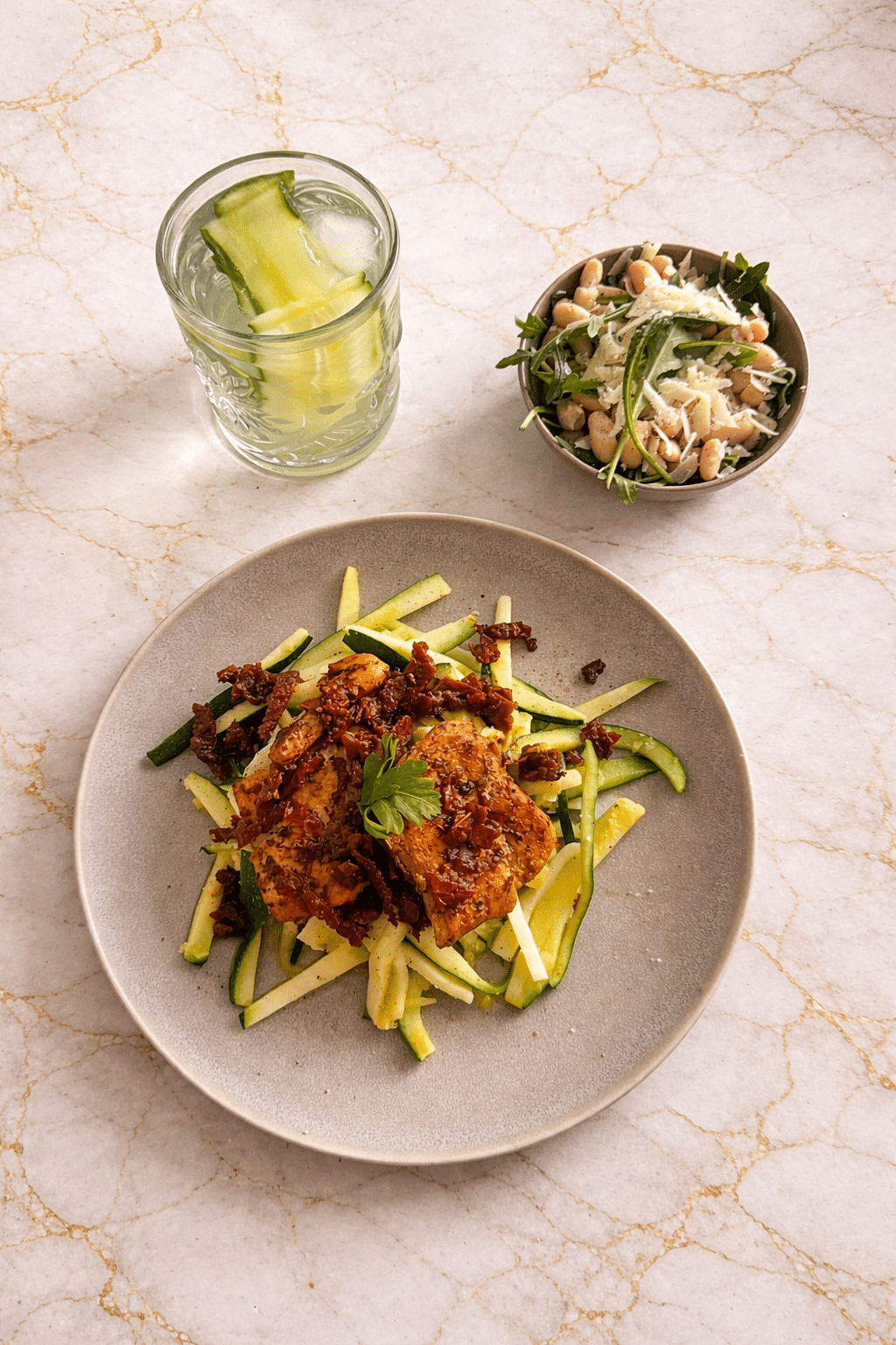 - Serve the chicken over the zucchini noodles with white bean arugula salad and cucumber water.