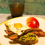 Serve the eggs with avocado toast, bacon, and nectarine.