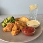 Serve the baked chicken nuggies, potato wedges, steamed broccoli with low-sodium ketchup, honey mustard and lemon sparkling water.