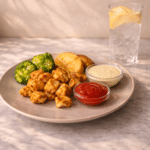 Serve the baked chicken nuggies, potato wedges, and steamed broccoli with low-sodium ketchup, honey mustard dip, and lemon sparkling water.