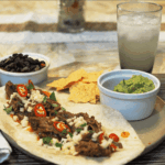 Serve: Plate tacos with chips, guacamole, black beans, and a virgin margarita. Enjoy!