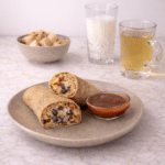 Serve the burrito with the pear mixture, hot green tea, and cold milk.