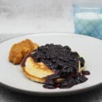 Top the pancakes with blueberry syrup and serve with chicken sausage.