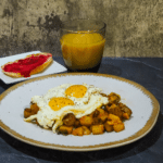 Portion the potatoes and serve the eggs over top, serve with toast and orange juice. Serve your desired amount of hot sauce and/or ketchup if using.