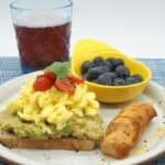 Top the toast with eggs and tomatoes. Serve with chicken sausage and blueberries.