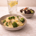 Add pasta, grilled chicken, and broccoli to the Alfredo sauce. Toss to coat. Add reserved pasta water as needed for creaminess. Garnish with remaining Parmesan.