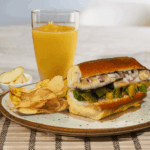 Serve the broodje haring with potato chips, pickle spears, pear slices, and mango lassi.