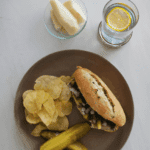 Serve the broodje haring with potato chips, pickle spears, pear slices, and lemon sparkling water.