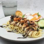 Serve the chicken with the pasta. Top with the tomato bruschetta and drizzle with balsamic glaze. Serve with bread on the side.