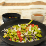 Portion the quinoa into then top with grilled chicken, tomato, cucumber, avocado, feta cheese, and red onion. Drizzle with the prepared sauce.