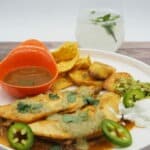 Heat a large nonstick pan on medium heat. Dip the tacos shells into the pot with the pork to coat them well on both sides and place them in the pan. Spread the cheese onto the shell and top with pork (work in batches if needed) until the shell is browned and the cheese is melted. Then fold in half and serve with a cup of the sauce on the side for dipping. Drizzle with salsa verde. Garnish with cilantro and jalapeno (if using). Serve with sour cream.