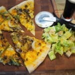 Evenly spread the onions, peppers, mushrooms, and steak on the pizza. Top with the remaining cheese.