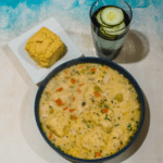 Pour the cornbread batter into the greased baking dish and bake for about 20-25 minutes, or until the top is golden brown and a toothpick inserted into the center comes out clean. Set aside to cool before portioning.