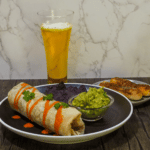 Serve the burrito with chips and guacamole, sour cream, and beer. Drizzle the burrito with hot sauce if desired. Enjoy with churros.