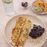 Serve the chicken enchiladas with black beans, chips and guacamole, lime chia sparkling water, and dates for dessert.