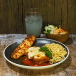 Serve the chicken with pasta, salad, breadstick, and sparkling lemonade.